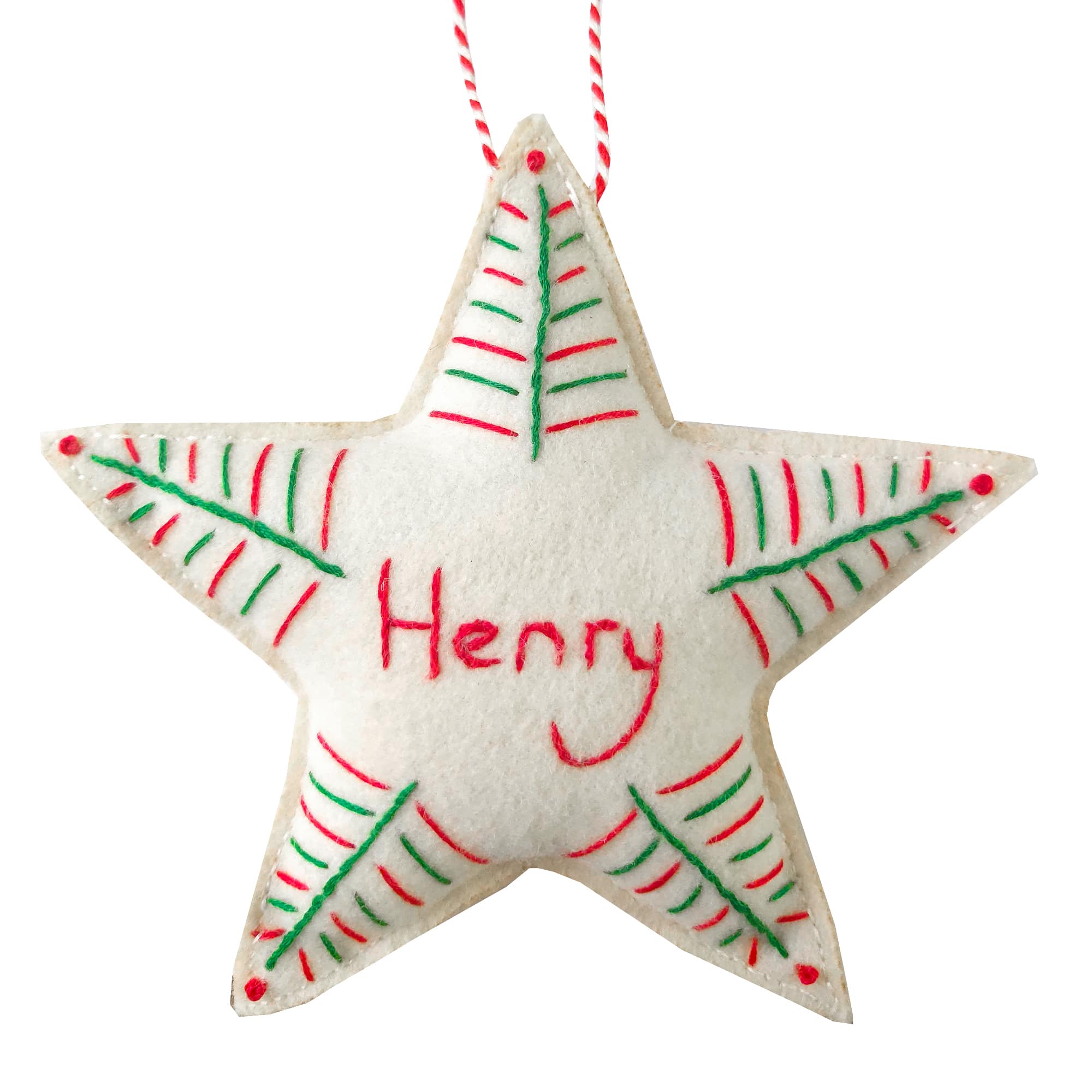 Add a twinkle to your home with our personalised handmade felt decoration. Hand-embellished with green and red threads on snow white felt, this star can be customised with the name of your choice - simply add the details to be hand-stitched onto your star to the text box above.
