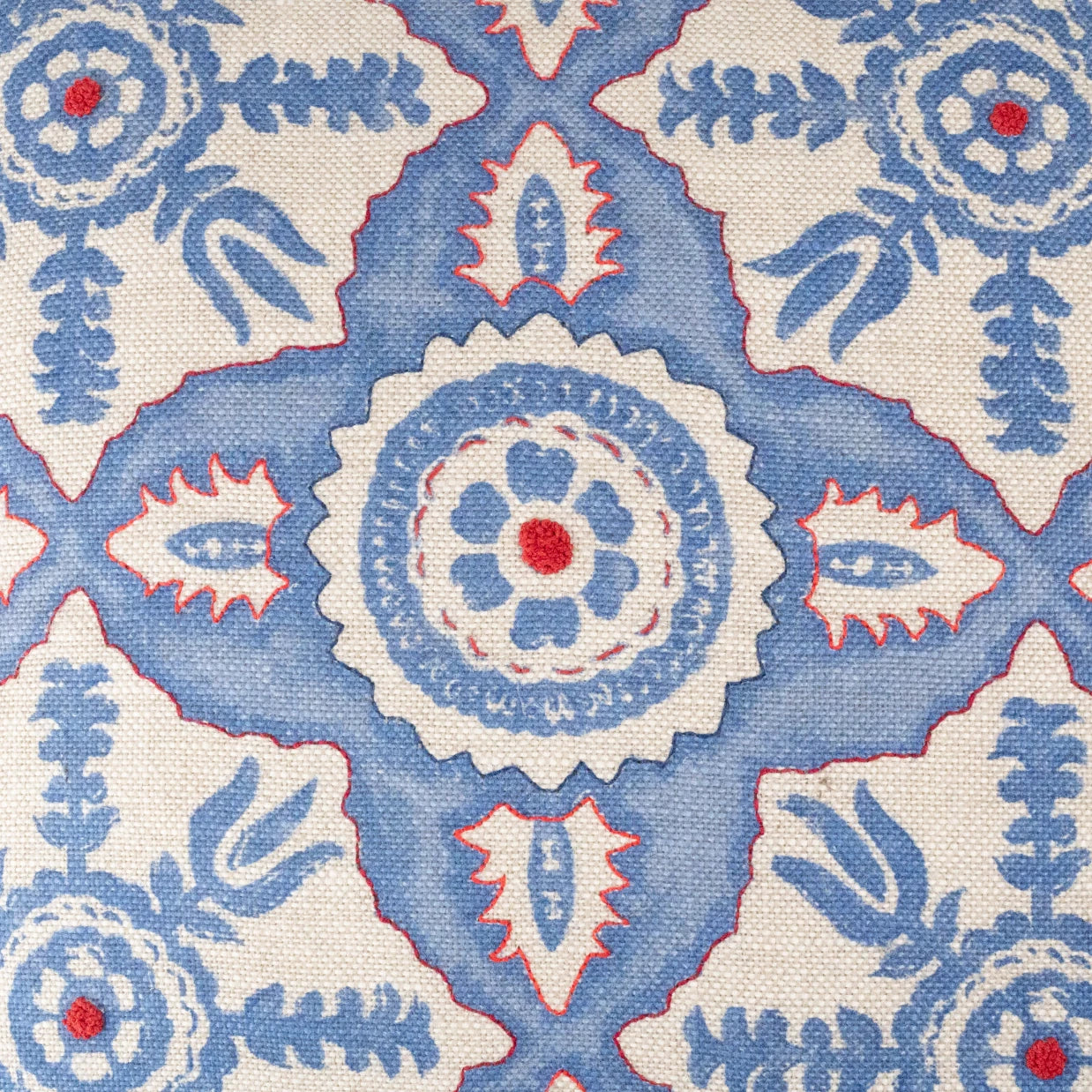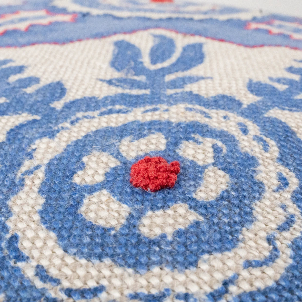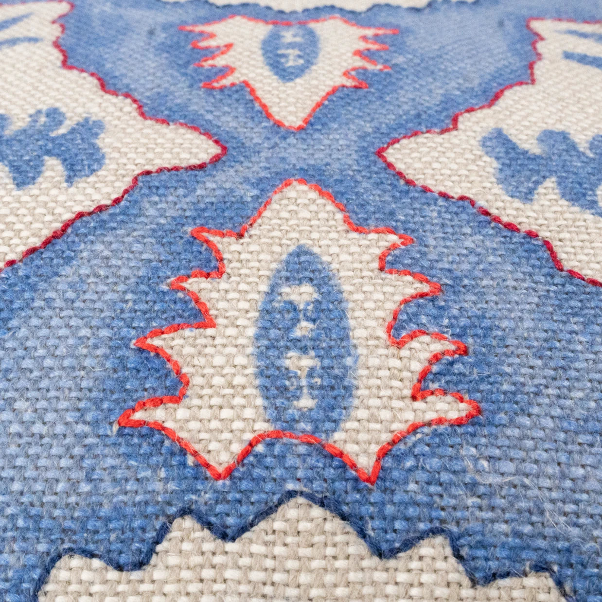 This indigo blue linen cushion pairs fabric from Blithfield's Chatham Collection with hand-embroidered red details to make a vibrant accessory for both traditional and contemporary homes.