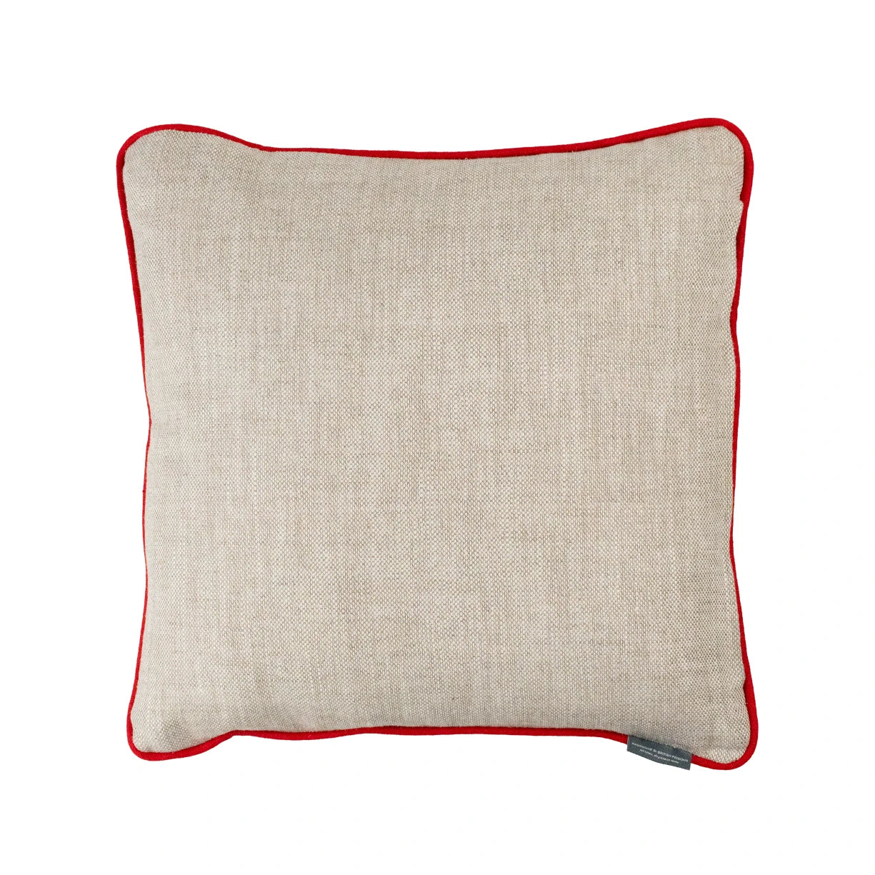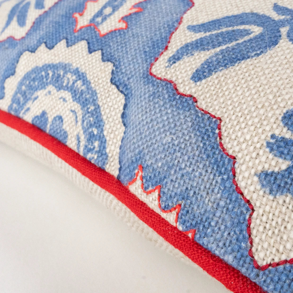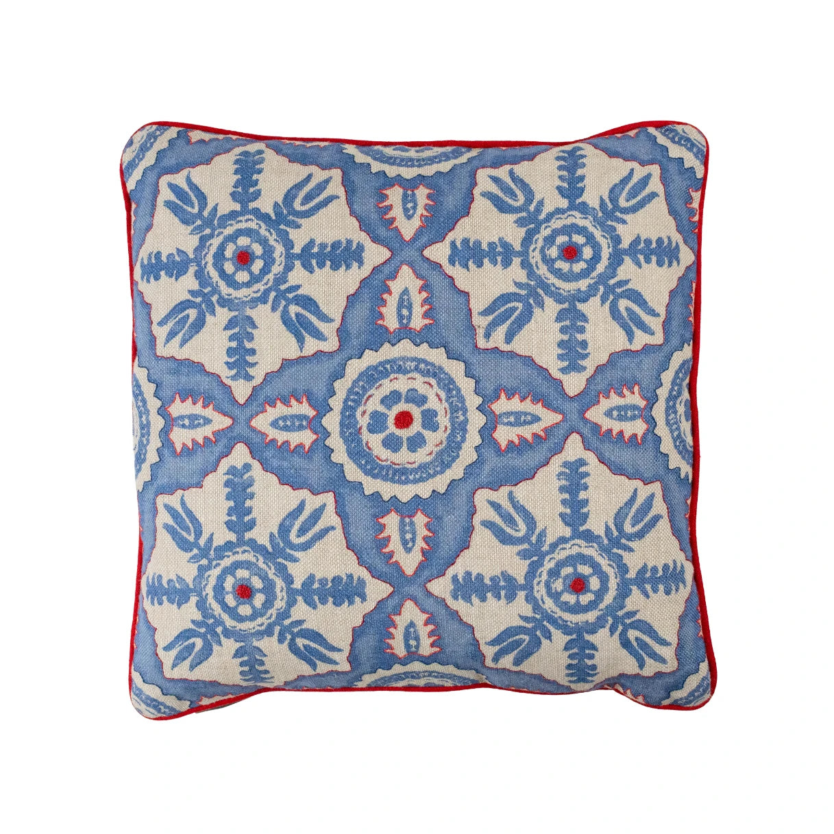 This indigo blue linen cushion pairs fabric from Blithfield's Chatham Collection with hand-embroidered red details to make a vibrant accessory for both traditional and contemporary homes.
