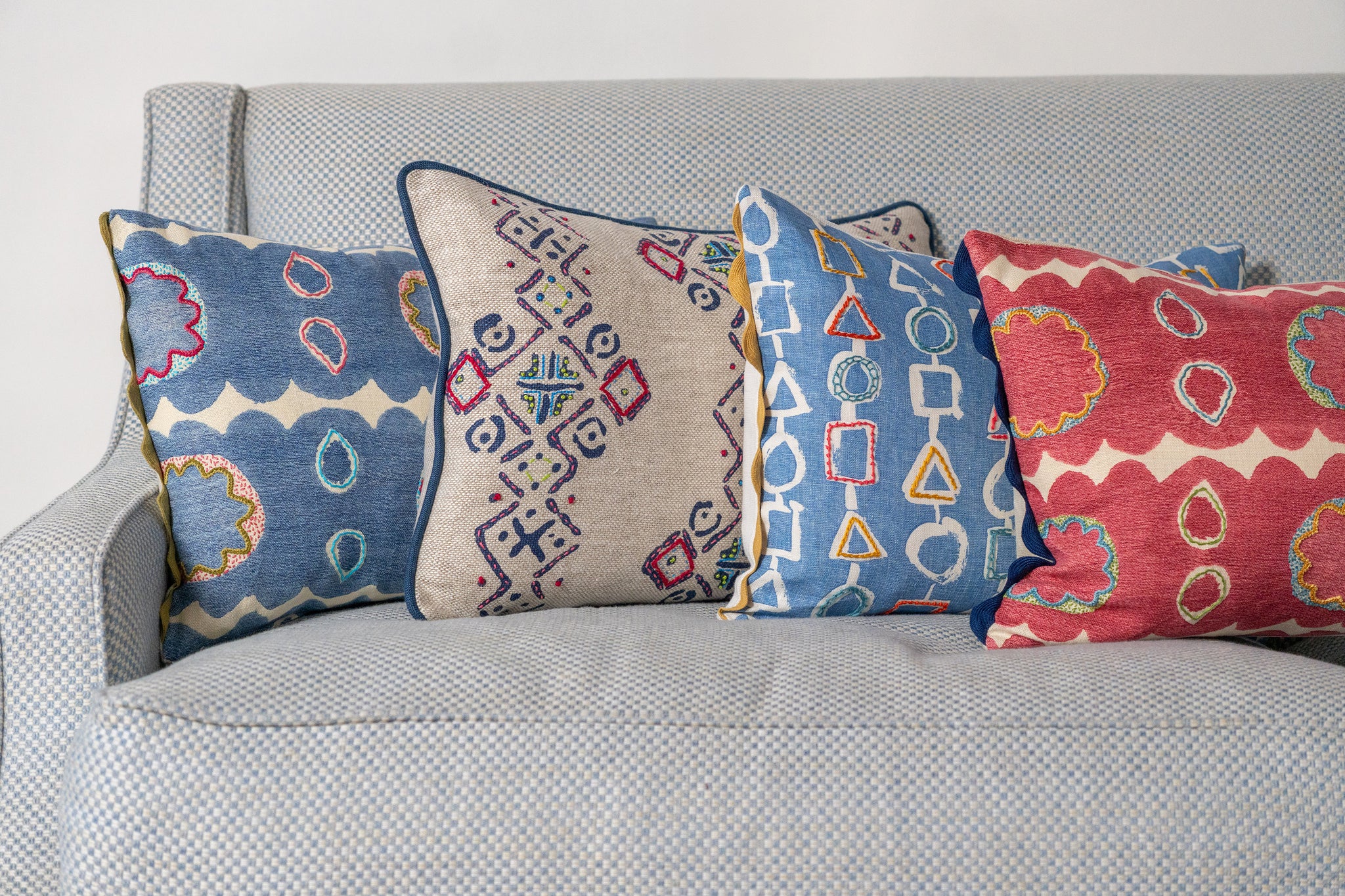Together they selected Blithfield designs that would lend themselves perfectly to vibrantly stitched embellishment with embroidery and enhanced with French knots. The cushions include Circles, Oakleaves, Pineapple and Small Damask from the Peggy Angus Collection, as well as Rossmore and Stratford.