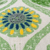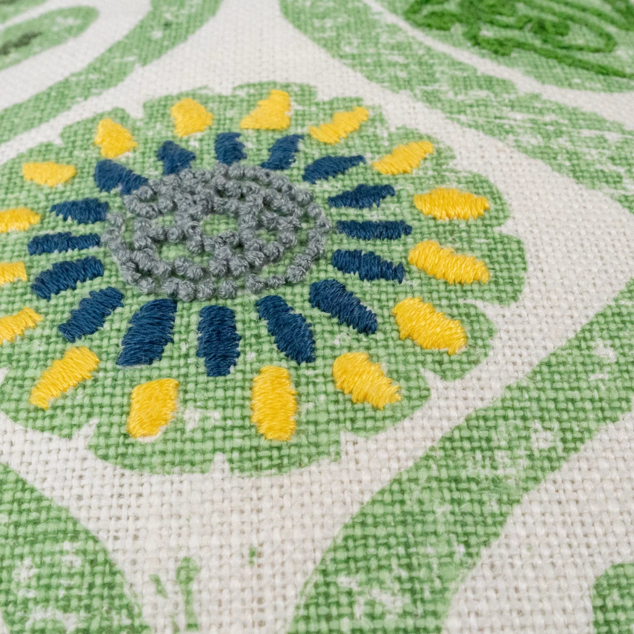 This green linen cushion pairs Oakleaves fabric from Blithfield's Peggy Angus collection with Kit Kemp's design of hand-embroidered accents in leaf green and yellows, making a charming accessory for both traditional and contemporary homes.