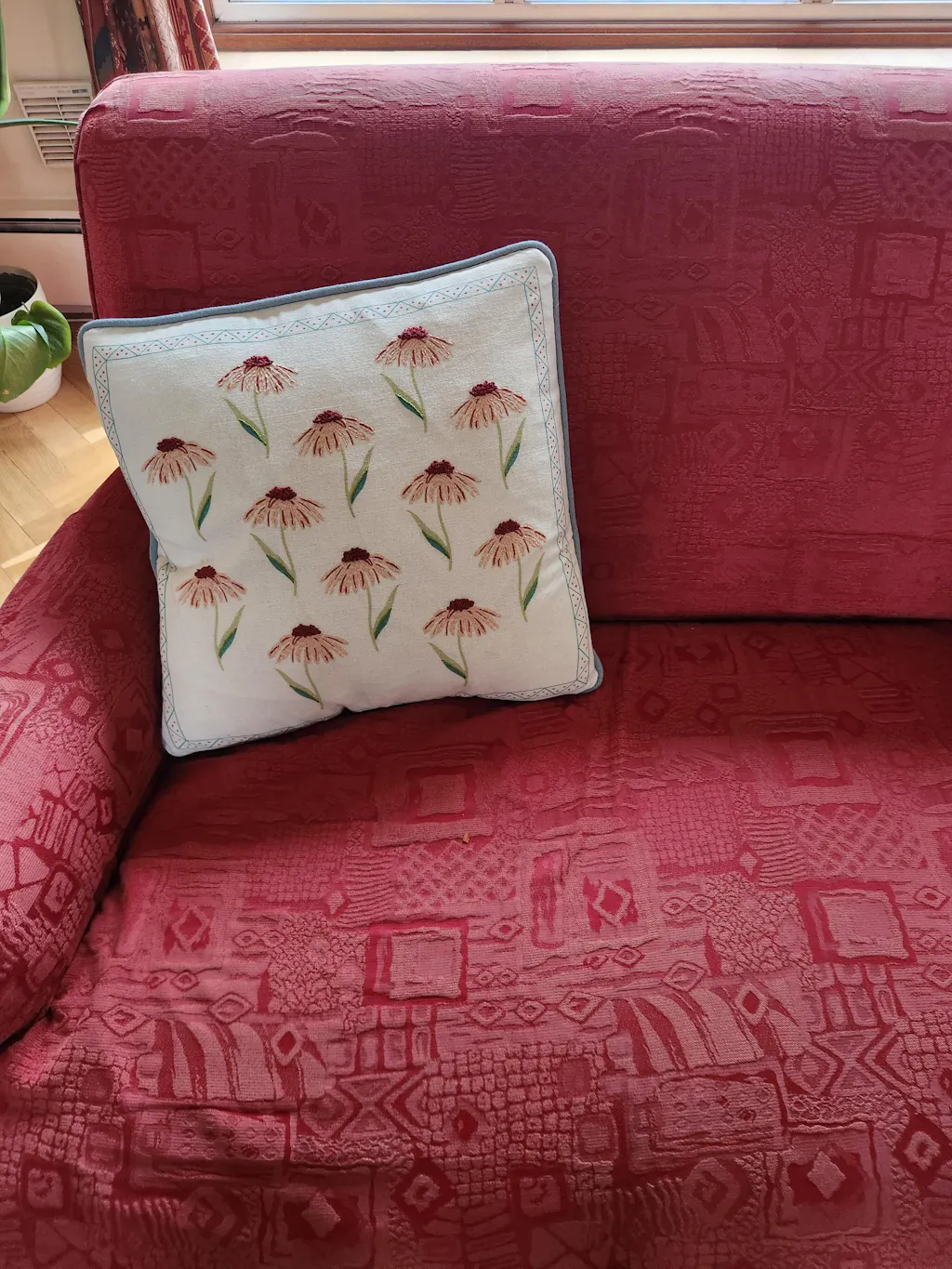 Inspired by The Stitchers' Garden at The RHS Chelsea Flower Show 2022., this ecru linen cushion features Echinacea daisies embellished with French knots, stem and running stitches, in accents of blush pink, rust red and avocado green.