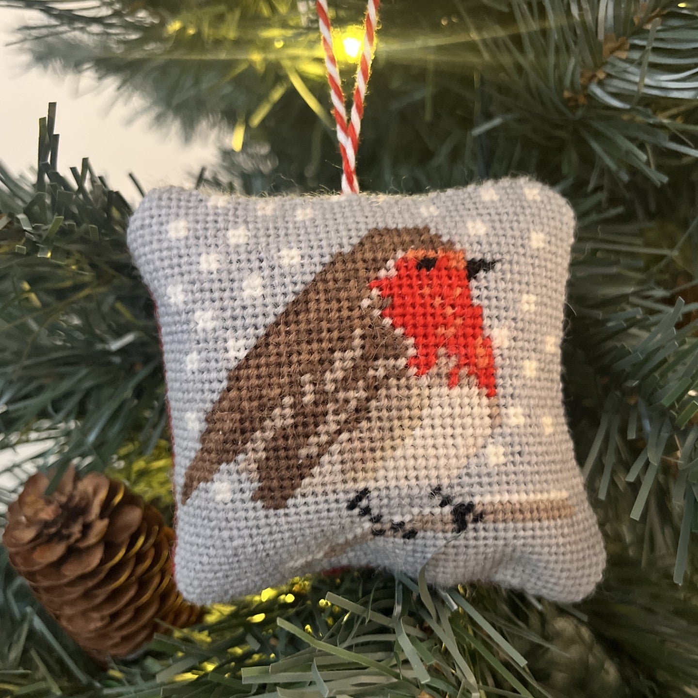 This classic Christmas robin is a handmade needlepoint decoration made from British wools. Each one is backed in a grey satin fabric and edged in a festive red cord.
